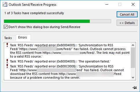 If Microsoft Outlook cannot download your RSS feed content because of a problem connecting to the server, here are some solutions that you can use to fix this problem. If you can open the Microsoft Outlook progress window, you may see an error message – Task RSS Feeds reported error 0x80004005, 0x800C0008, 0x8004010F.